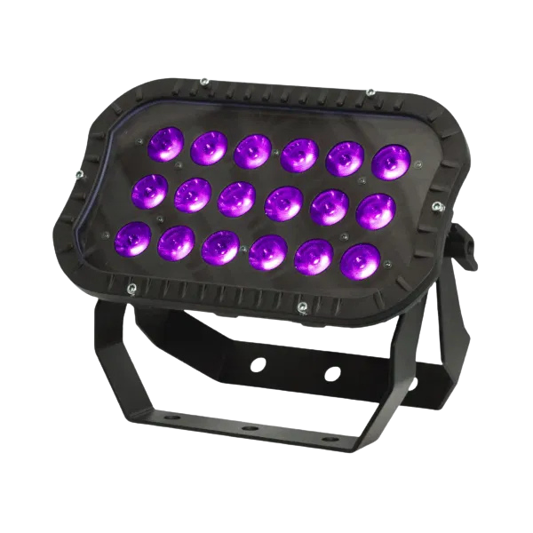 The exterior Spectra Flood 18HEX10 features 18 x 10W six-colour LEDs, delivering a smooth wash of colour, ranging from intense, rich saturated hues through to pastel shades. Controllable via the on-board 4 button LED menu system for auto, static colour or master/slave modes, with the option of DMX control for larger installations. Signage and facade features can be illuminated along with landscapes, and the simple daisy chain connection of power and DMX means that installation time and cost is reduced. The heavy-duty alloy enclosure is convection cooled for silent running and features Hydralock power and DMX inputs and outputs.